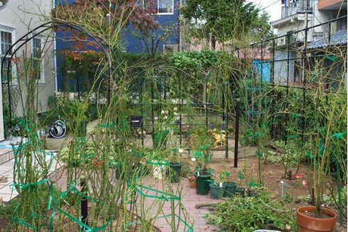 パイプを黒色にペイント 表の背の高いアーチ 庭の中のアーチ wx 曇り 銀色に輝くパイプを黒色にペイントしました。 なかなか難しく骨の折れる作業になりました。スクリーンとアーチのつるバラの結束を全て外し、要らない枝を切り取り、パイプから少しでも離…