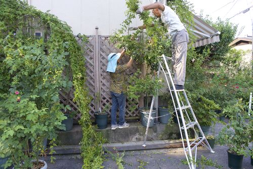 wx 晴れ 34.6度 今日は朝夕の潅水しました。 日中は気温が高過ぎるので14:00 を過ぎてからバラの作業を始めました。 庭の様子、 2022 新苗 3月中旬に10cm位だった苗が8号懸崖鉢で大きく育ち、きれいな花を何度も見せてくれました。もう暫くで剪定です、Saka …
